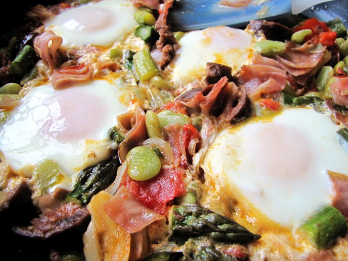 Ingredients: 1 lb asparagus, eggs, half of a Spanish chorizo, 2 chopped garlic cloves, 1 each medium size onion, tomato and sweet red bell pepper, salt and pepper to taste, a pinch of pimenton, and extra virgin olive oil for sauteing and sprinkling after baking.