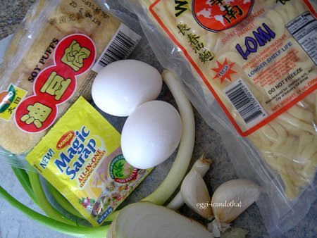 (where else?). Never tried cooking these before but eaten them more than 20 years ago in Manila maybe once or twice. I looked online for the Pinoy recipe, substituted soy puffs (fried tofu) for the shredded chicken. I did not add sesame seed oil because the lomi I remember did not have it. The beaten eggs added right after the heat was turned off give the noodle dish an interesting texture and of course added protein. The ingredients I used are pictured above (I forgot to include the carrots in the photo). With plenty of seasonings you won't really miss the chicken. This is a very substantial and satisfying Filipino meal.